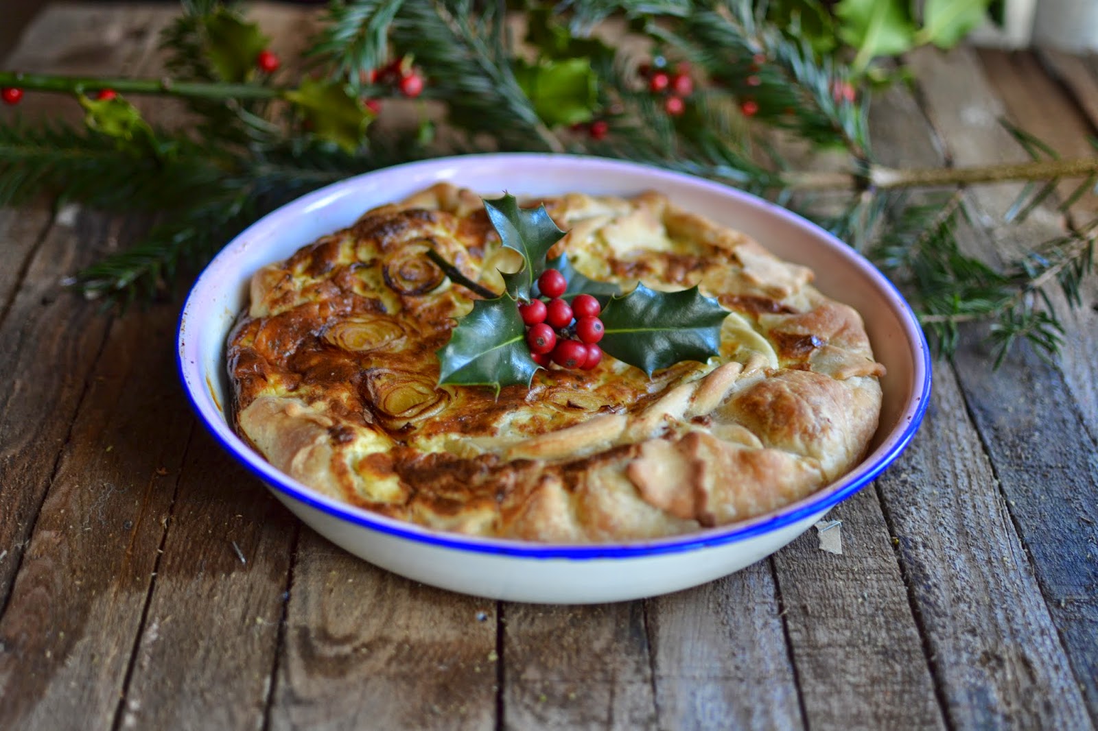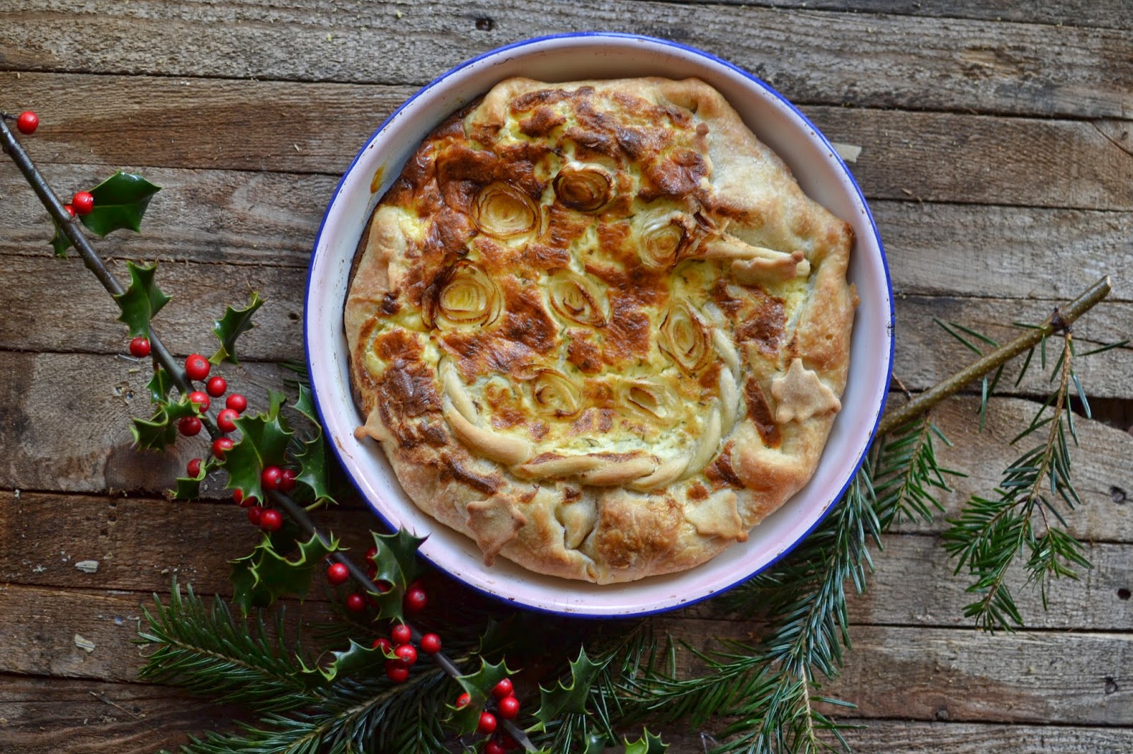 Combine all the ingredients to make the dough, leave it to rest for 10 minutes, then roll it out and following the picture guidance below. Cut the dough towards the centre 6-7 times, leaving the centre out. Spread the melted lard all over it and turn each segment individually in to the middle to create a sort of mound as shown in the second picture. Leave to rest for a few minutes, then roll it out to be bigger than the size of the baking dish that you are using. Place it over the greased baking dish and fill.